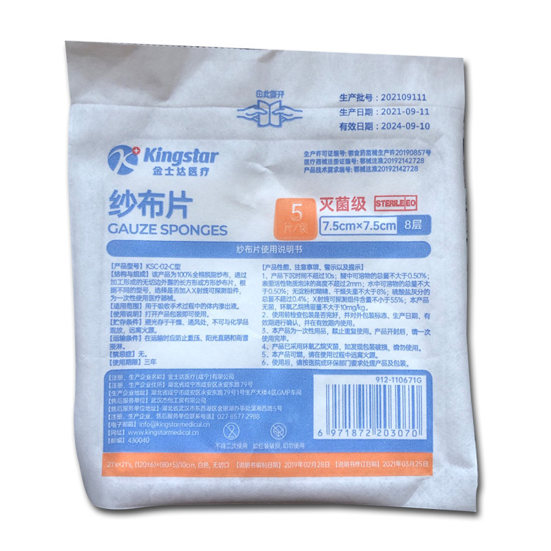 Марлевые листы Kingstar, стерильные, 7,5см*7,5см*8 слоев, 5 шт./пакет