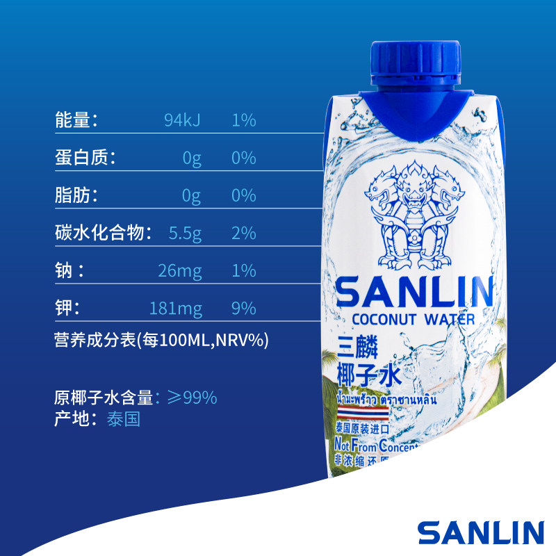 Полное описание三麟 100%кокосовая вода богата натуральными электролитами Таиланд, импортированный кокосовый сок кокосового фрукта NFC 330 мл*12 ящиков для бутылок