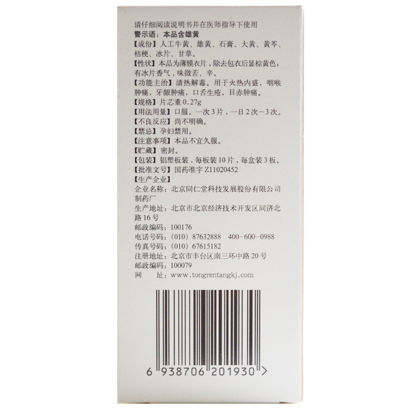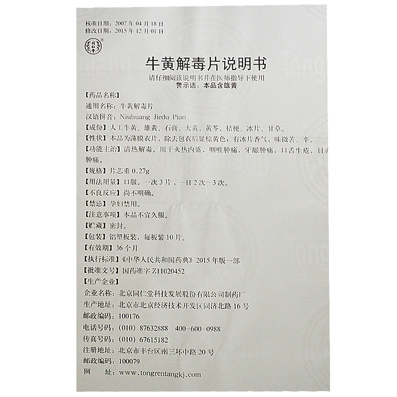 同仁堂 Niuhuang детоксикация таблетки 0,27 г*30 таблетки/коробка фармацевтического магазина Флагманский магазин Официальный флагман