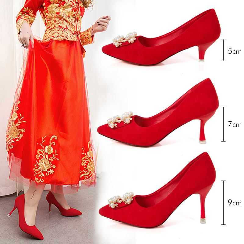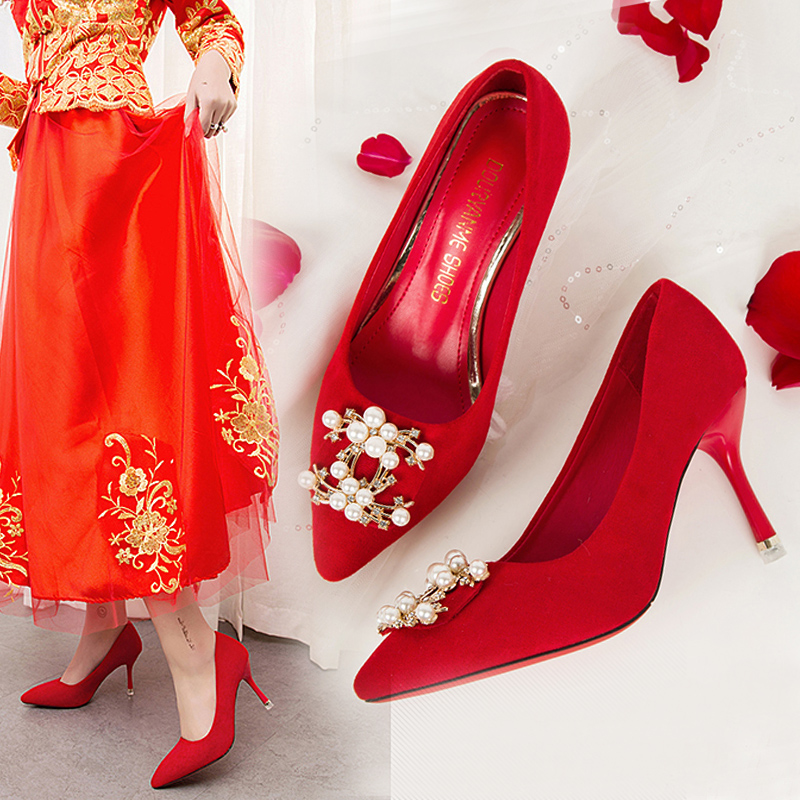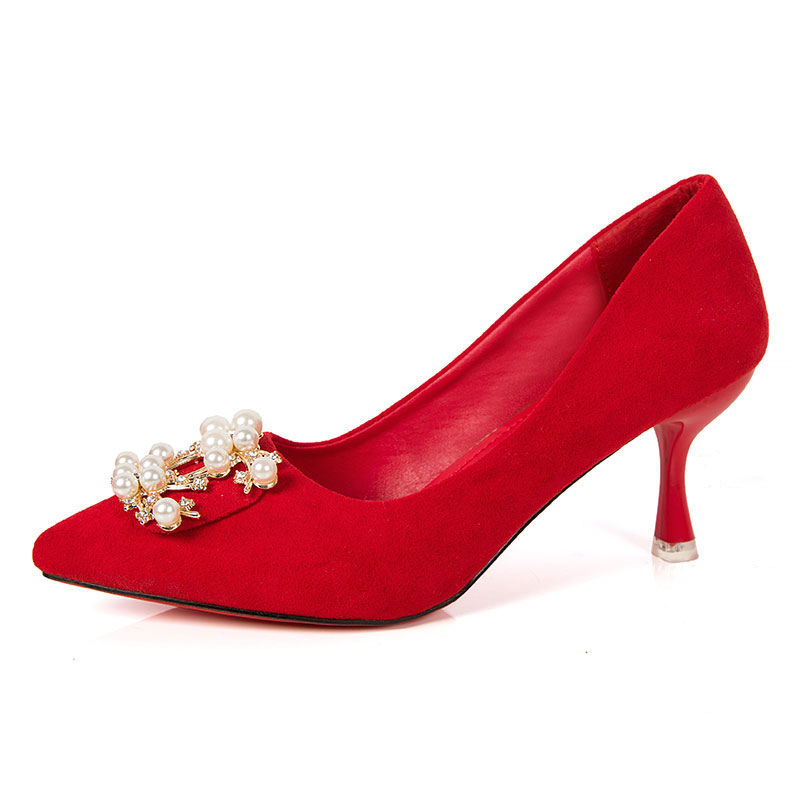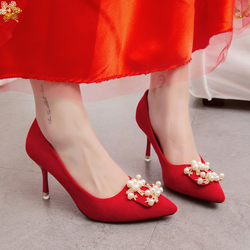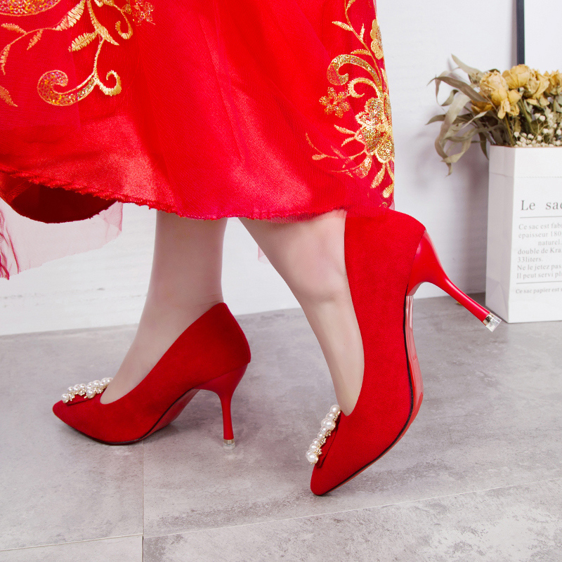 Осенние красные свадебные туфли с заостренным носом, модная высокая рабочая обувь