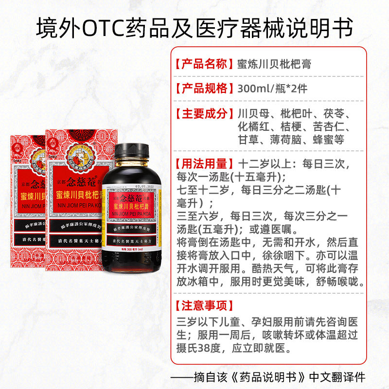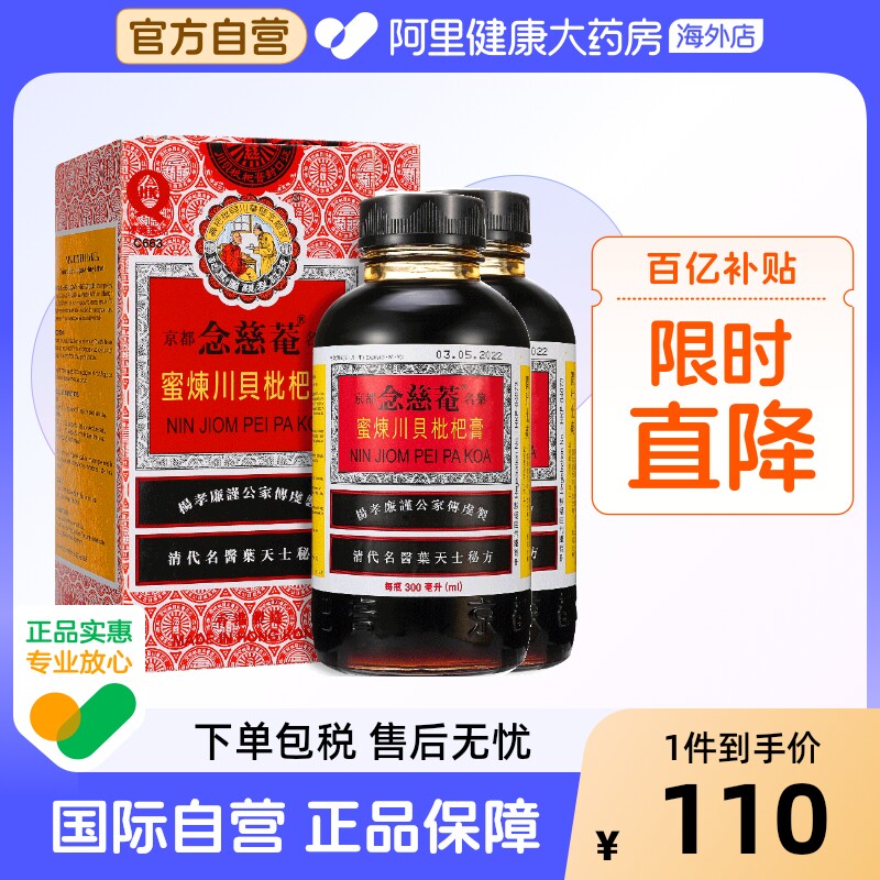 2 бутылки] Китайская гонконгская версия Kyoto Ninjian Honey, рафинированный крем из сычуаньской фасоли и мушмулы, 300 мл сиропа от кашля для снятия жара и защиты горла.