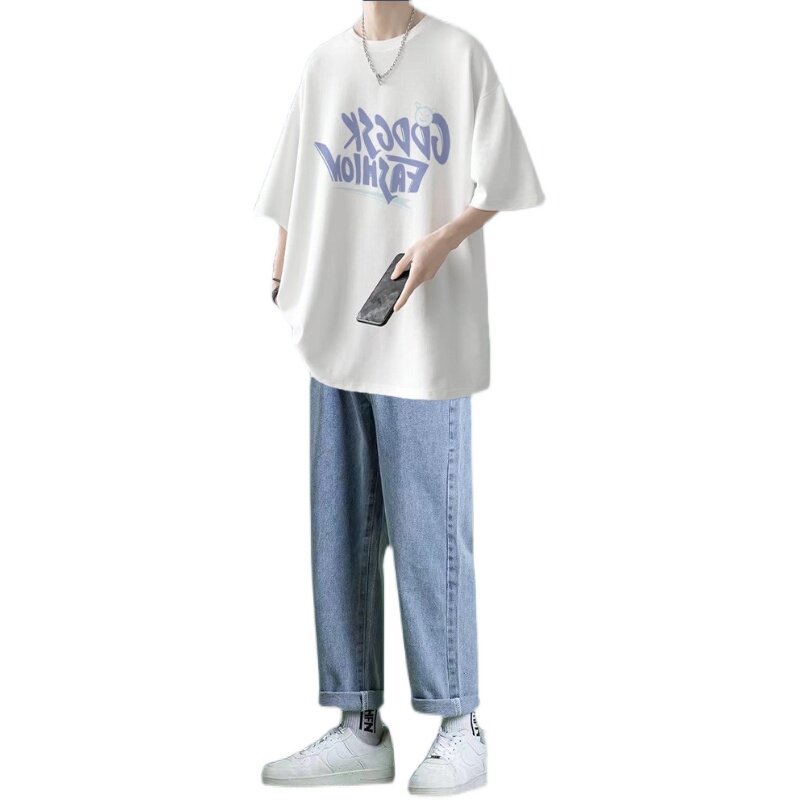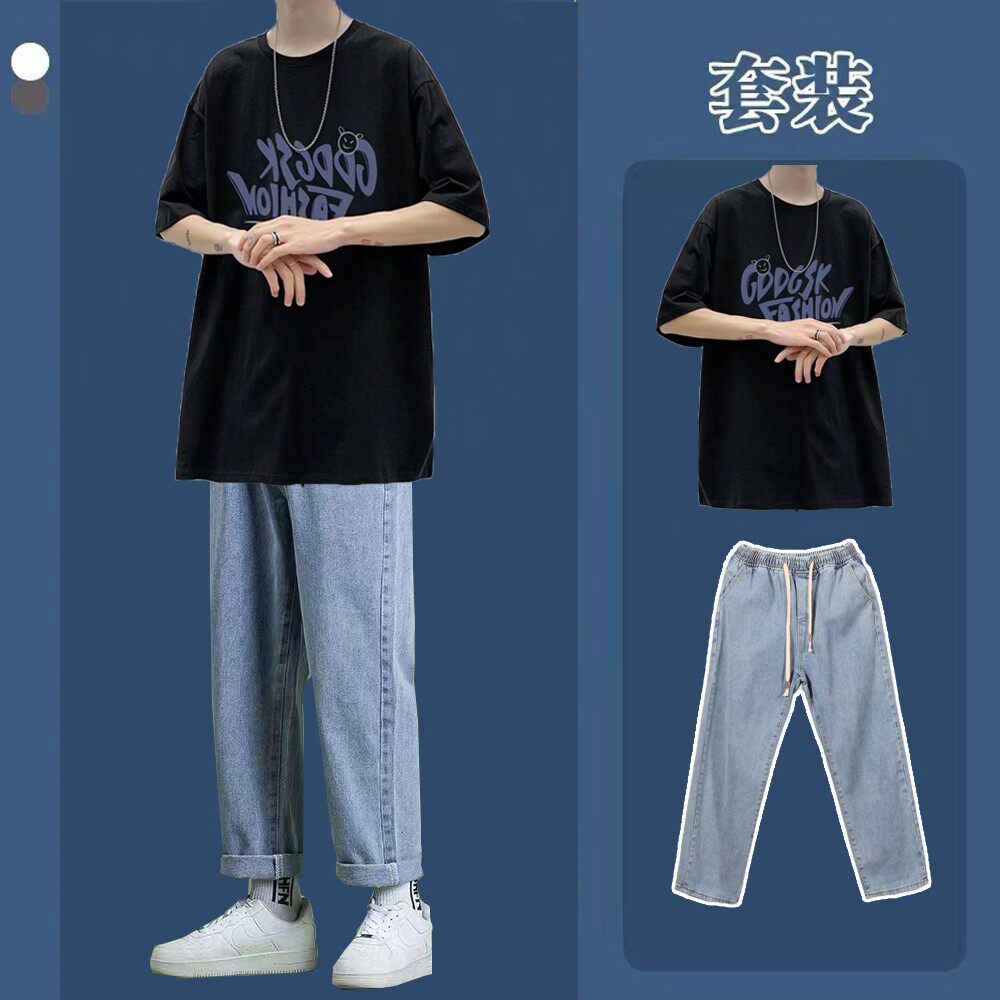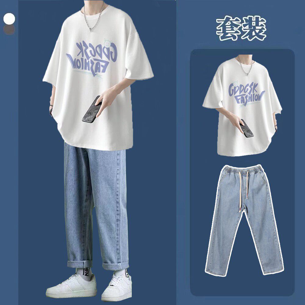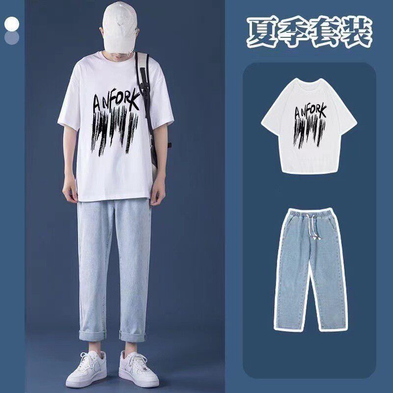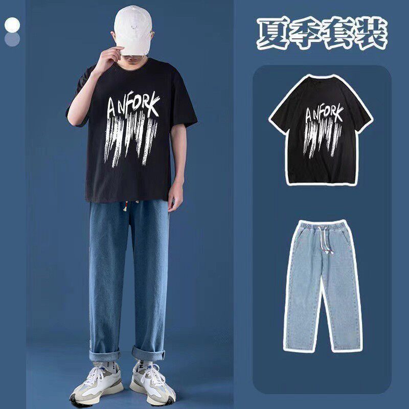 Летние джинсы, мужские трендовые штаны, комплект для отдыха, короткий рукав