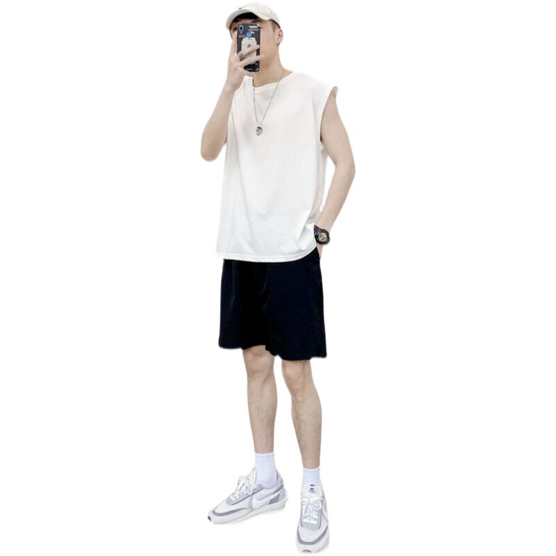 Футболка без рукавов, майка, мужские шорты, летний трендовый комплект, пляжные шелковые штаны