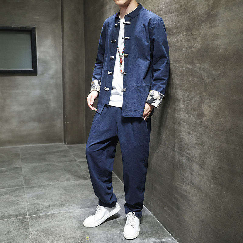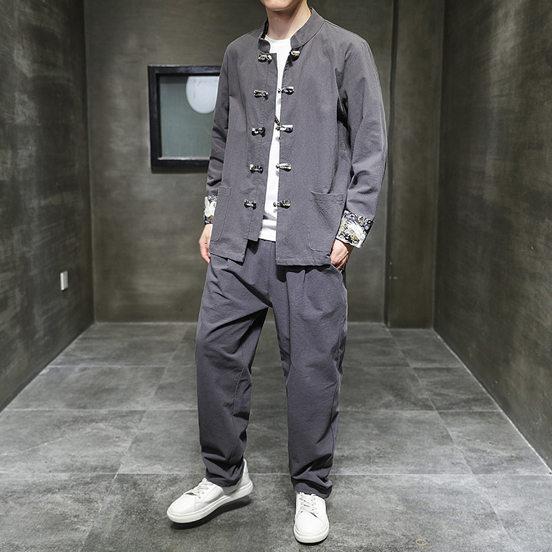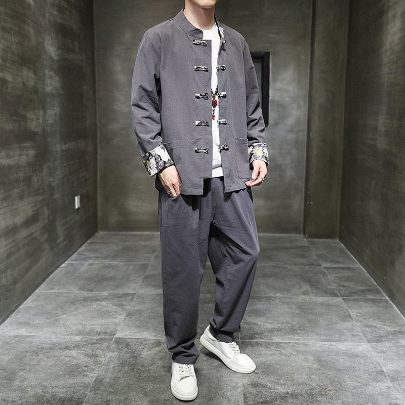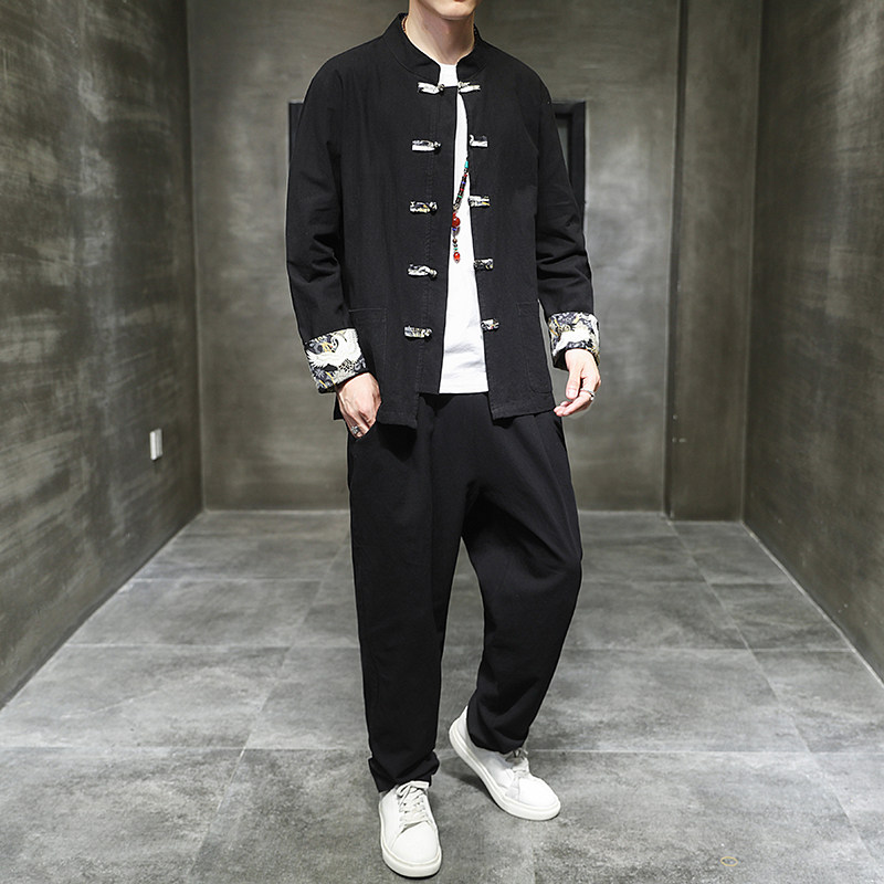Комплект, ретро ханьфу, этническая куртка, китайский стиль, из хлопка и льна, оверсайз