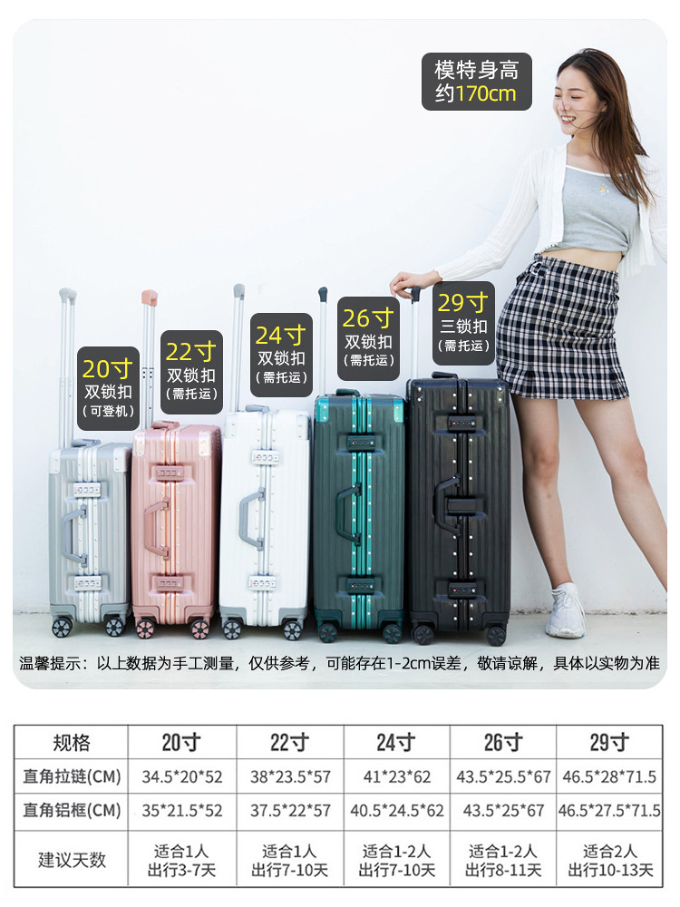 - Размер : 20-дюймовая прямая посадка Подходит для 1-3 дня страхование доставкипожизненная гарантия , 22-дюймовый короткое путешествие Подходит для 3-5 дней страхование доставкипожизненная гарантия , 24-дюймовая средняя и дальняя поездка подходит для 4-8 дней доставка транспортной страховкигарантия на протяжении всей жизни , 26-дюймовый на длинные дистанции подходит для 6-10 дней страхование доставкигарантия на протяжении всей жизни , 29 -Придворная большая мощность подходит для более 10 дней страхование доставкипожизненная гарантия