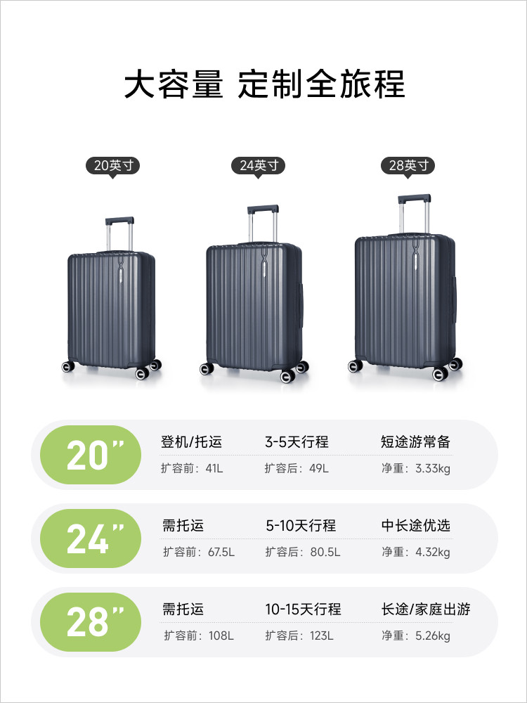 - Размер : 20 -INCH Обновление может быть поднято в боковую ручку и без бусин для ног , 24 дюйма научное хранение влажного и влажного разделения требуется для расширения , 28 -INCH Расширяемый требует партизации двойного двойного 8 -шобоченного гибкого снижения шума , Плавный чемодан 16 дюймов