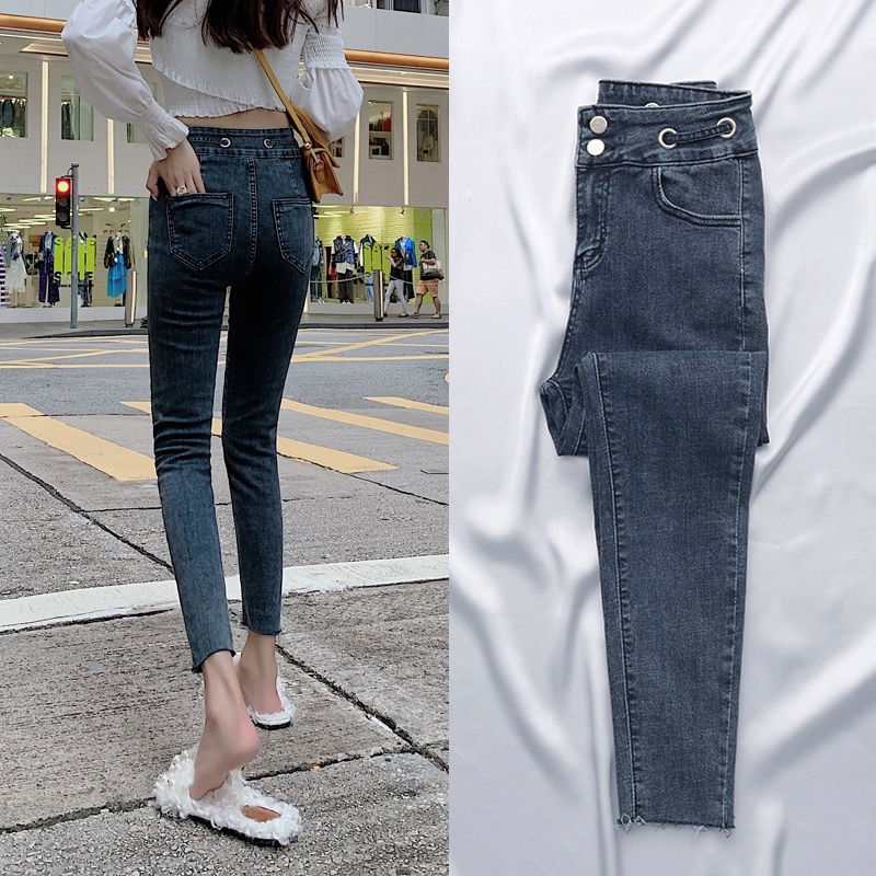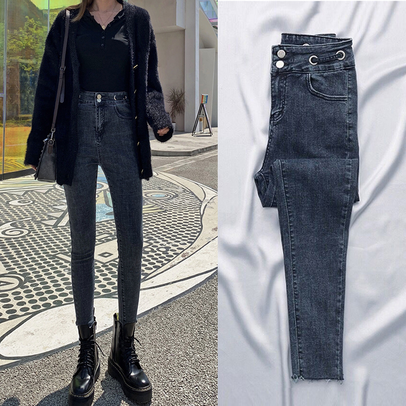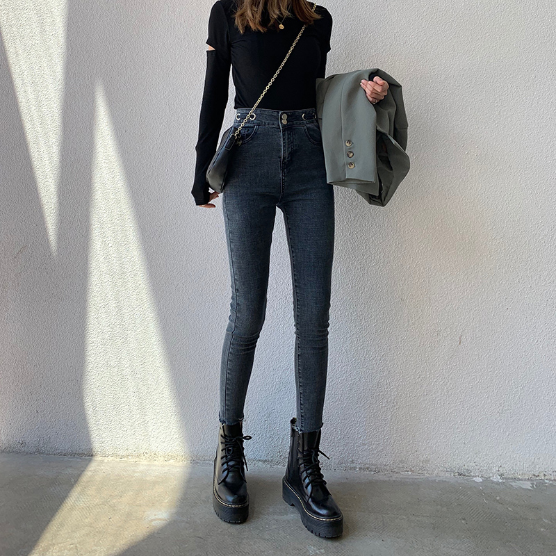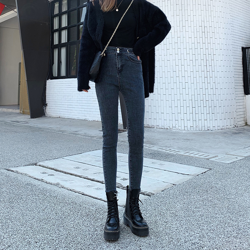 Осенние джинсы, демисезонные штаны, популярно в интернете, высокая талия, в обтяжку, по фигуре, облегающий крой