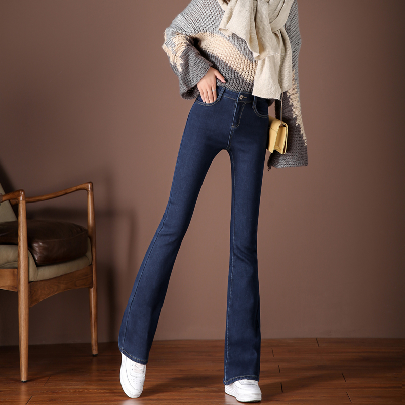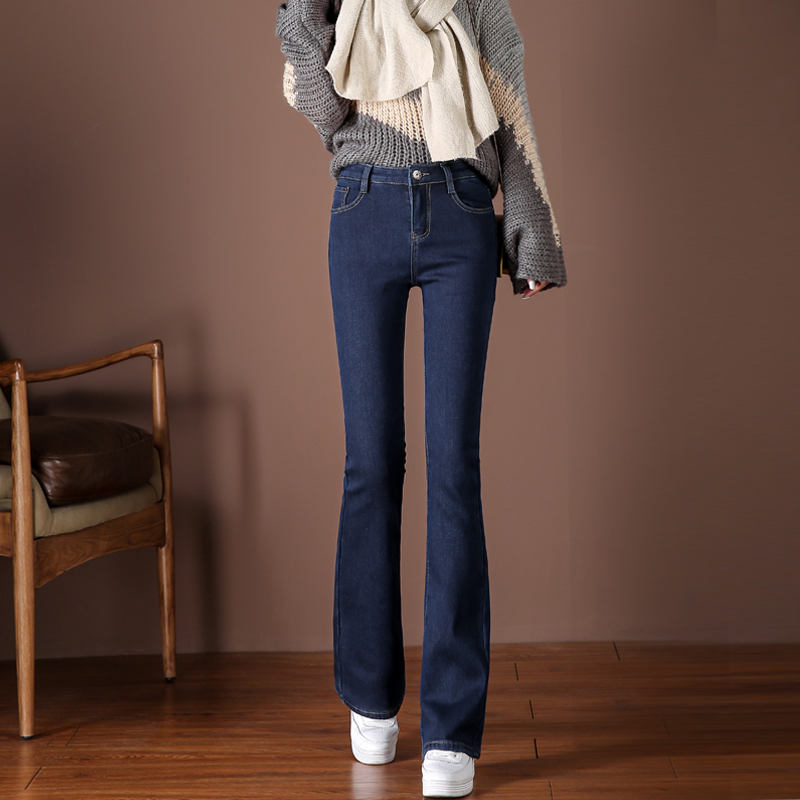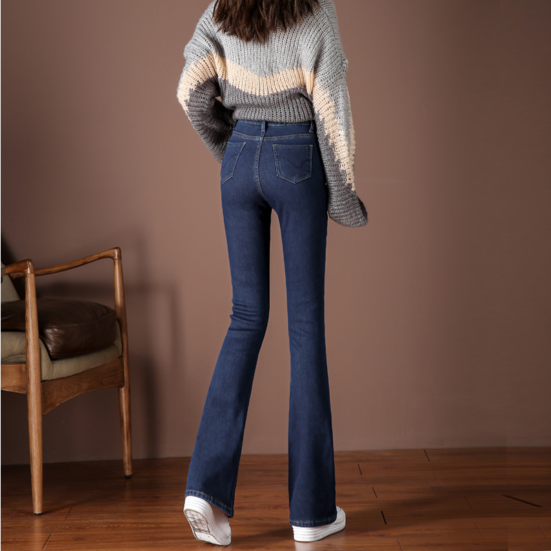 Мегафон, утепленные мягкие джинсы, демисезонные штаны, эластичные штаны-клёш, высокая талия, по фигуре, облегающий крой