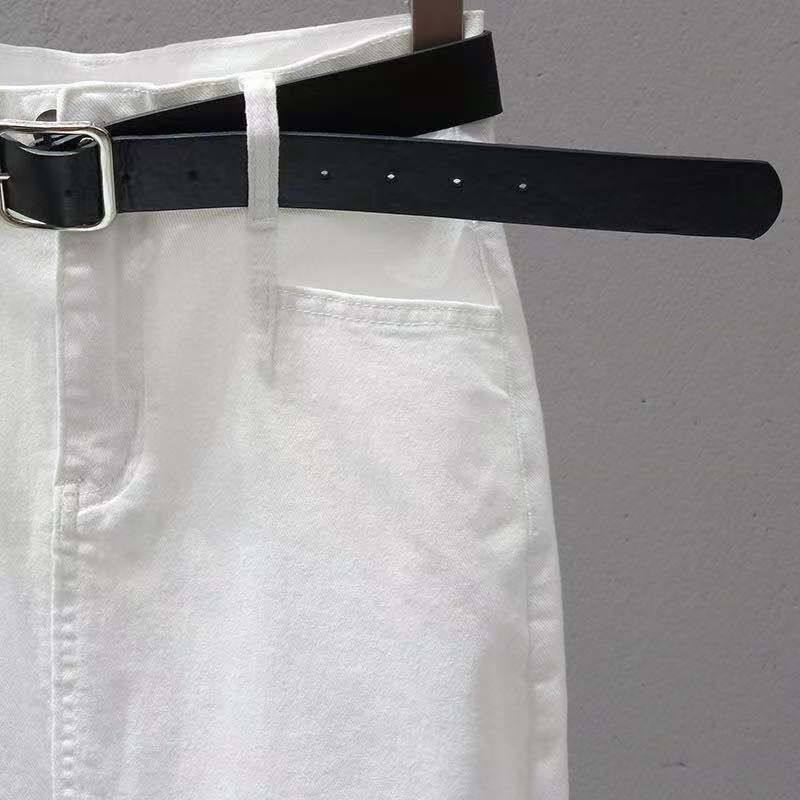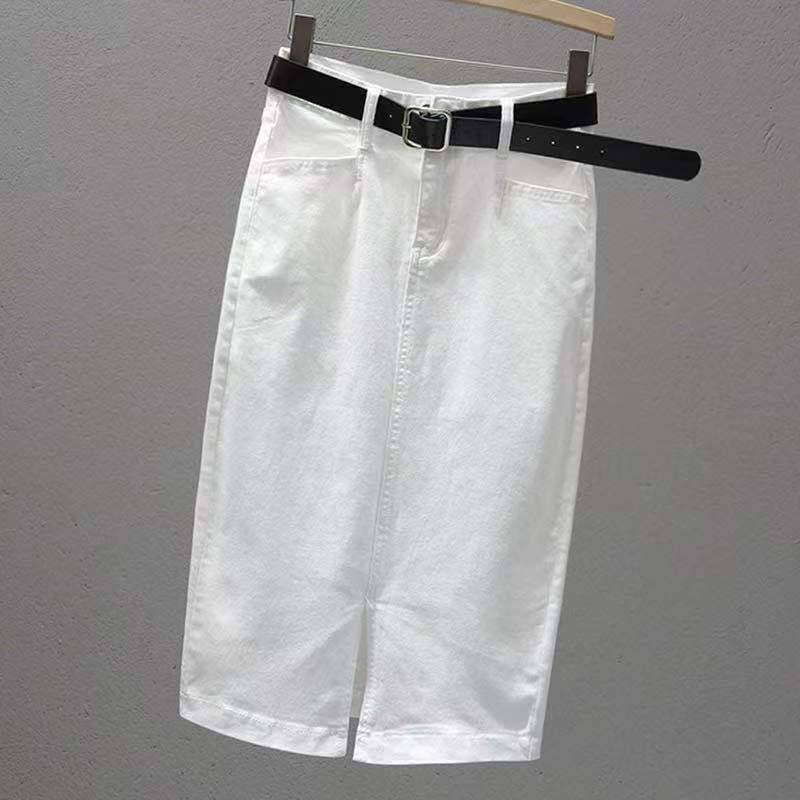 Длинная летняя белая эластичная приталенная джинсовая юбка, средней длины, с акцентом на бедрах