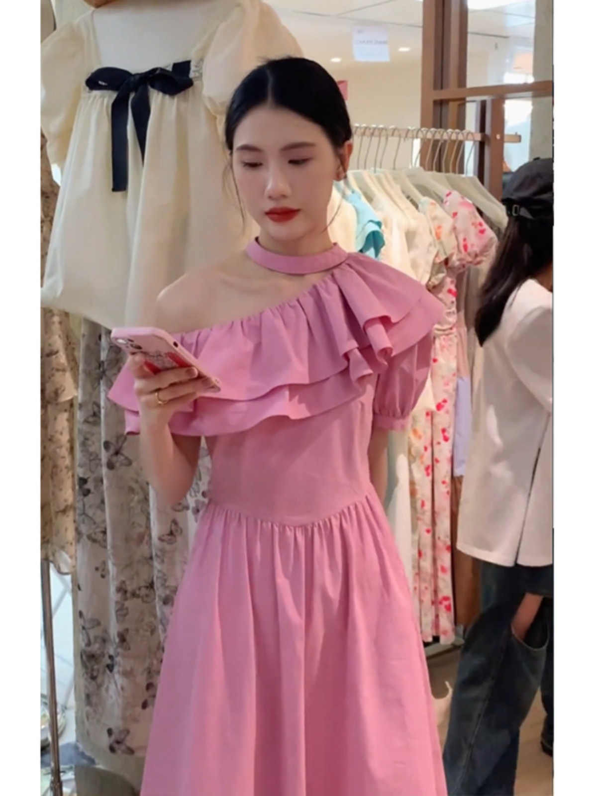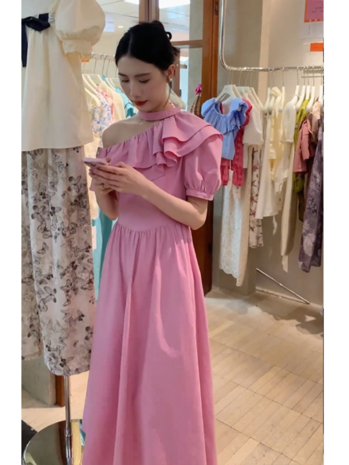 Розовое платье, летняя летняя одежда, весенняя длинная юбка, эффект подтяжки, французский стиль
