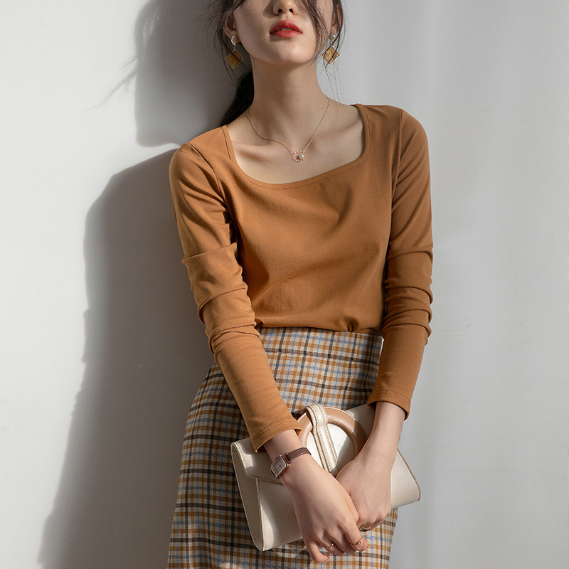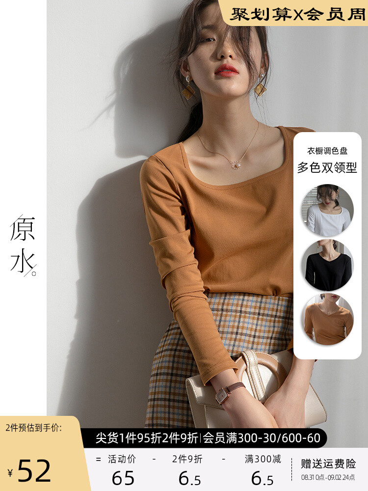 原水 Демисезонный дизайнерский приятный телу лонгслив, французский стиль, квадратный вырез, тренд сезона, V-образный вырез, высокий воротник