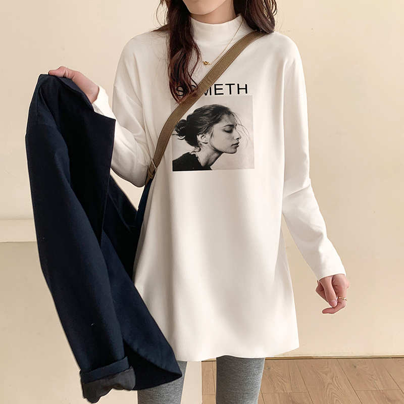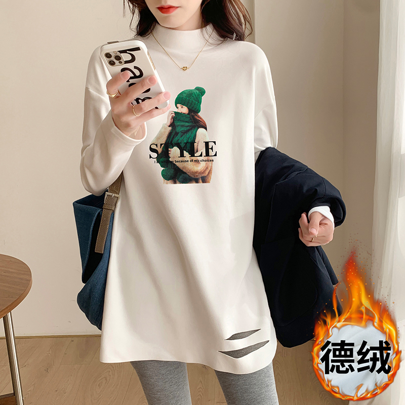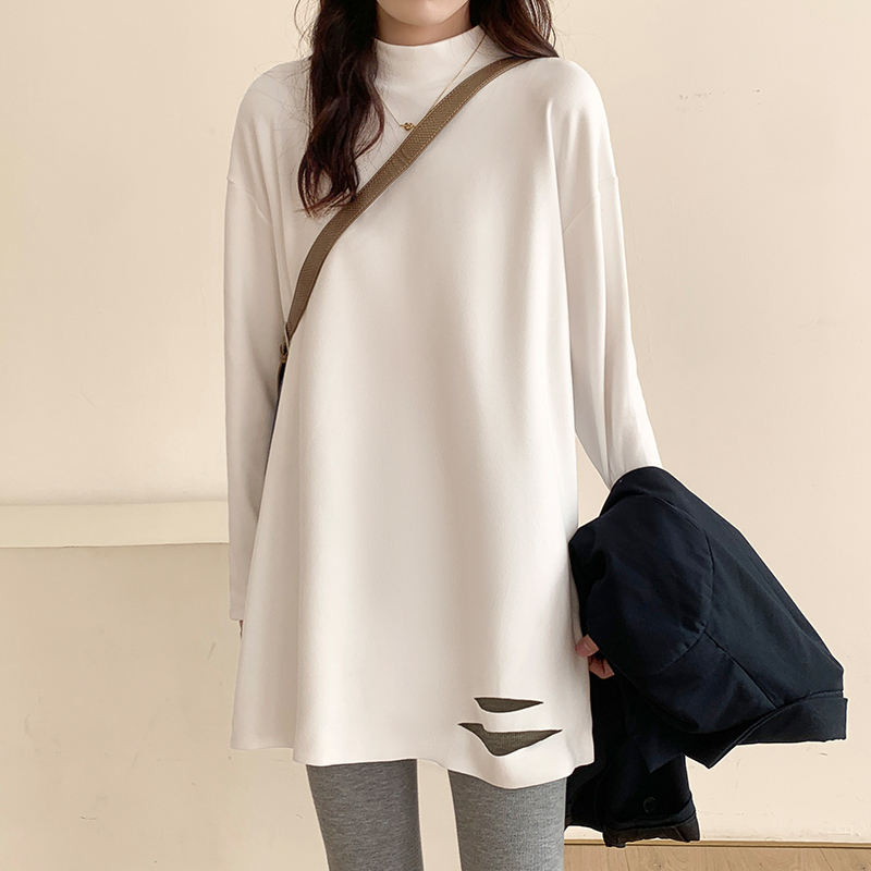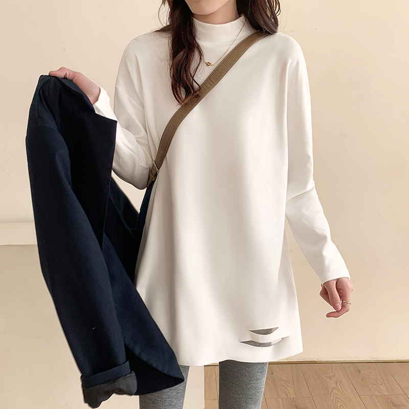 Бархатный приятный телу осенний флисовый лонгслив, белая футболка, длинная толстовка, высокий воротник, в западном стиле, средней длины